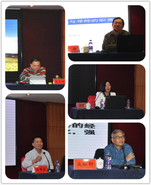 成松柳作《思维、方法与技能研究生培养的三个维度》专题报告。他提出,要让阅读和思考成为一种生活方式,建议导师指导学生要从经典出发,培养学生的研究性思维和创造性思维。