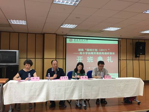 开班典礼由华东师范大学教育学部培训部主任郁泓女士主持。华东师范大学基础教育与终身教育处副处长韩楠女士致欢迎词,并介绍了华师大教育学部师资与学术活动情况,同时希望全体参训学员珍惜机会、虚心求教、积极参与、加强责任感和使命感,做到带着问题来,满载收获回。湖南省中小学教师发展中心副主任李再湘作了重要讲话,一是介绍了办班的意义;二是阐述了教育人最核心的素养是教育情怀、社会担当和原创能力;三是提到了文化人的特质是根植于内心的修养,无需提醒的自觉,有纪律有约束的自由,处处为他人着想的善良;四是提醒了教师要做六有“新老师”:心中要有梦,身上要有情,手中要有书,眼中要有事,工作要有心,生活要有色彩;五是要能够趁势而上,借势而为,造势而立。华东师范大学教育学部副主任陈向东先生出席了开班仪式。