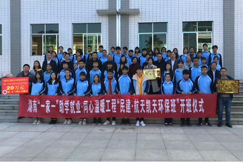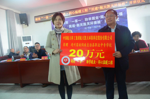 此次爱心团队由民建省委副主委、省科技厅副厅长朱皖带队,中国航天科工集团航天凯天环保科技股份有限公司捐资20万元,资助靖州50名贫困学子完成职业教育学业并推荐实习就业。