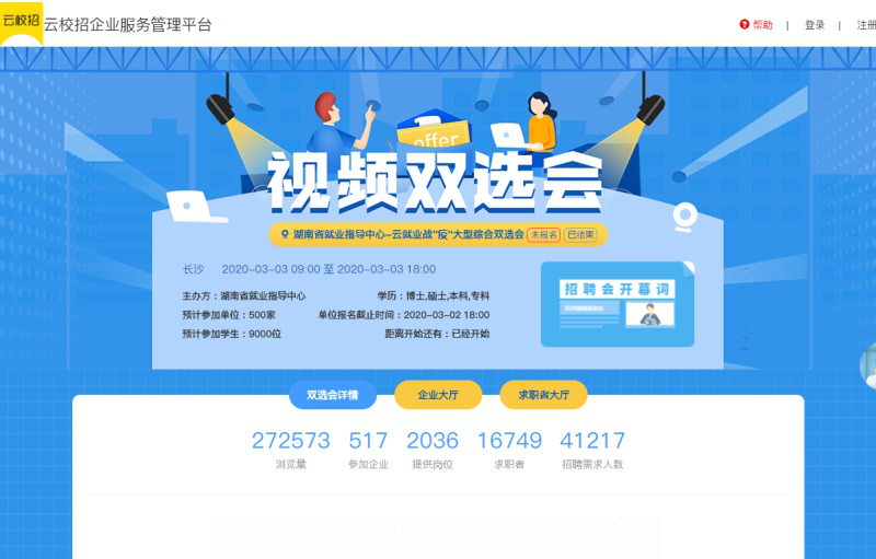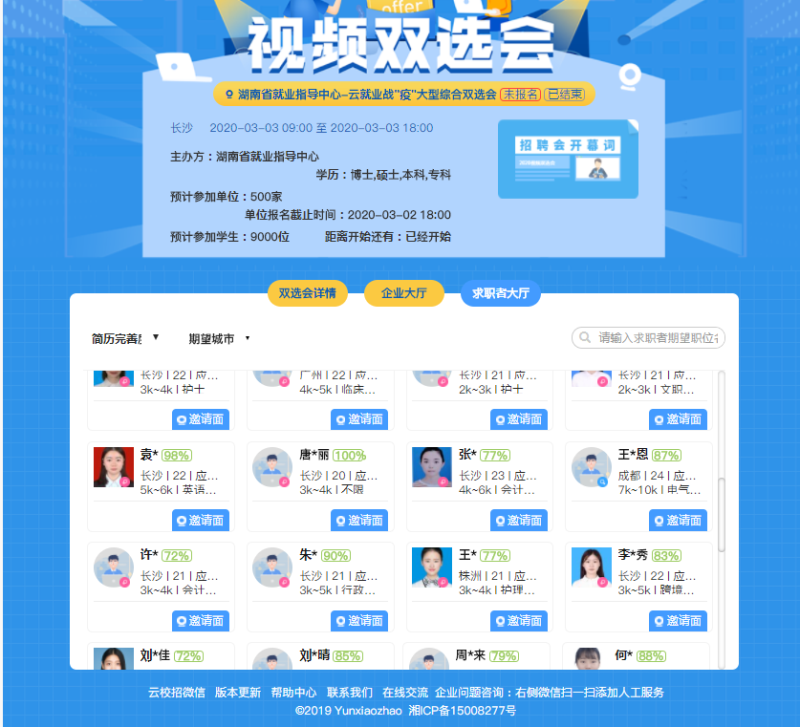 3月3日,由湖南省教育厅毕业生就业办公室、湖南省大中专学校学生信息咨询与就业指导中心主办的第一场云就业大型视频双选会在网上进行得如火如荼。通过线上视频双选会,筛选后的用人单位可直接发布岗位需求,毕业生进入“快招聘”小程序进行在线投递简历、申请面试、排队等待、即时沟通、线上视频面试等操作,全程实现“非接触式”线上求职,真正做到防疫期间“就业服务不打烊、网上招聘不停歇”。