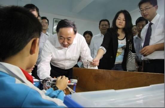 湘潭市处于“两型”先导区,“两型”学校创建得怎么样,“两型”人才如何培养?带着这个问号,袁贵仁考察了湘潭岳塘区火炬学校,到校后,校长黎辉介绍的“以科技为引领”培养两型人才的理念引起了袁贵仁的浓厚兴趣,他先后实地查看了机器人工作室、动漫俱乐部、科技馆等地。在机器人工作室,在观看了学生们自己研发的机器人表演后,袁贵仁拉着孩子们的小手鼓励说,国家需要各式各样的人才,不仅需要像爱因斯坦那样的大科学家,也需要像爱迪生那样的大发明家,你们这些小发明家长大后就是真正的科学人才!随后,在动漫俱乐部,袁贵仁观看了学生的原创动漫作品,对于学生们立志成为动漫人才十分赞赏。在科技馆,袁贵仁还观摩了学生们制作的大楼立体停车系统,不停地夸赞学生们的好创意,高度认可学校的科技教育成果。他对老师们说道,火炬学校的“两型”教育抓得很实也很新,生动体现了“两型”意识从娃娃抓起的办学理念,颇具特色的科技课程既开发了孩子们的智力,又极大培养了他们的动手能力,“教育一个学生,带动一个家庭,影响一个社区,辐射整个社会”的“两型”教育实践正成为现实,值得推介。