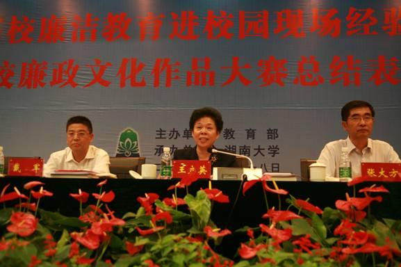 中纪委驻教育部纪检组组长、教育部党组成员王立英出席会议并讲话,湖南省政协副主席张大方致欢迎辞,中纪委驻教育部纪检组副组长、监察部驻教育部监察局局长徐开濯宣读了全国高校廉政文化作品大赛评选结果,湖南省委教育工委书记、省教育厅厅长王柯敏代表湖南作典型发言。会议由教育部思政司司长冯刚主持。中央纪委宣教室、湖南省纪委相关负责人也出席了会议。