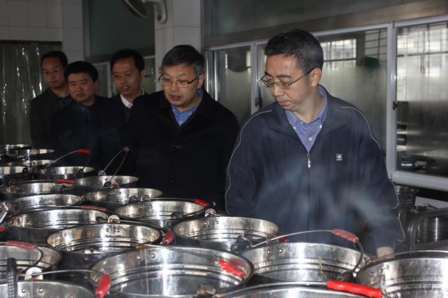 陈舜(右一)、王柯敏(右二)等在泸溪县明德小学食堂检查学生就餐环境和食堂卫生。