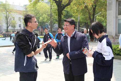4月1日,“国防七校”校园开放日在长郡中学举行,活动进行了大学生科技作品展示及演示,高校及专业情况咨询和推介,以及国防知识科普讲座。当天上午,省教育厅党组书记、厅长、省委教育工委书记肖国安刚刚主持开完一次会议,便轻车简从赶赴活动现场,看望了参加活动的领导、专家、老师和同学们,还接受了长郡中学校园记者的采访。