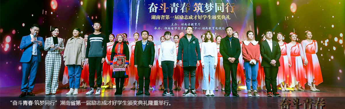 2019年12月27日上午, “奋斗青春·筑梦同行”湖南省第一届励志成才好学生颁奖典礼在湖南教育电视台举行。来自全省各市州和高校的10名“励志成才好学生”集体亮相。颁奖典礼上播放了十位典型人物的事迹短片,并对他们进行了现场访谈。10名获奖学生坎坷曲折的成长经历、自强不息的奋斗精神和励志成才的优秀事迹,深深打动了现场所有的观众。省教育厅党组副书记、副厅长、省委教育工委副书记王瑰曙;省财政厅党组成员,副厅长陈博彰;省教育厅党组成员、省委教育工委委员、主任督学郭建国;团省委副书记钟娜;湖南省教育基金会副理事长、省教育厅原巡视员汤汉文;湖南省学生资助研究会会长陈冬林;光明日报驻湖南记者站原站长唐湘岳;全国道德模范人物杨怀保、夏昭炎等领导和嘉宾为获奖学生颁奖。