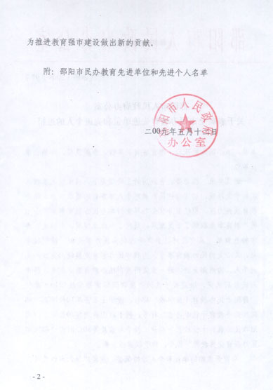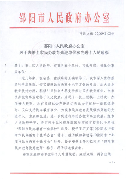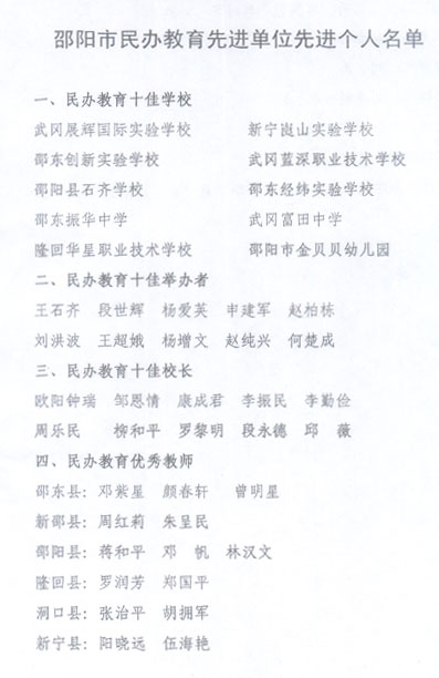 邵阳市人民政府办公室关于表彰全市民办教育先进单位和先进个人的通报