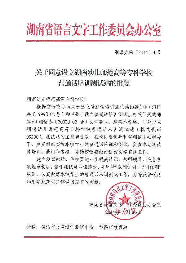 关于同意设立湖南幼儿师范高等专科学校普通话培训测试站的批复