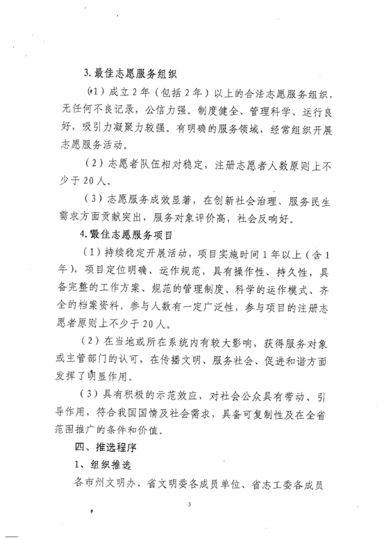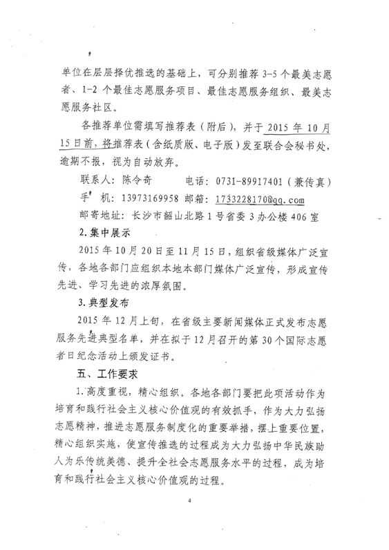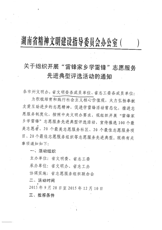 中共湖南省委教育工作委员会精神文明办公室 转发省文明办关于组织开展“雷锋家乡学雷锋” 志愿服务先进典型评选活动的通知 各普通高等学校: 现将省文明办《关于组织开展“雷锋家乡学雷锋”志愿服务先进典型评选活动的通知》转发给你们,请你们按照通知要求,认真做好宣传推选工作。各高校可分别推荐1个最美志愿者、1个最佳志愿服务项目、最佳志愿服务组织、最美志愿服务社区于2015年10月14日前报送我办。 联系人:殷劭,0731-82204082,xcb@hnedu.cn。报送地点:省教育厅办公楼十楼1008室。 中共湖南省委教育工作委员会精神文明办公室 2015年10月9日