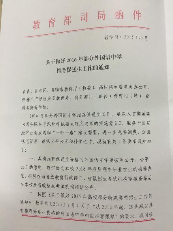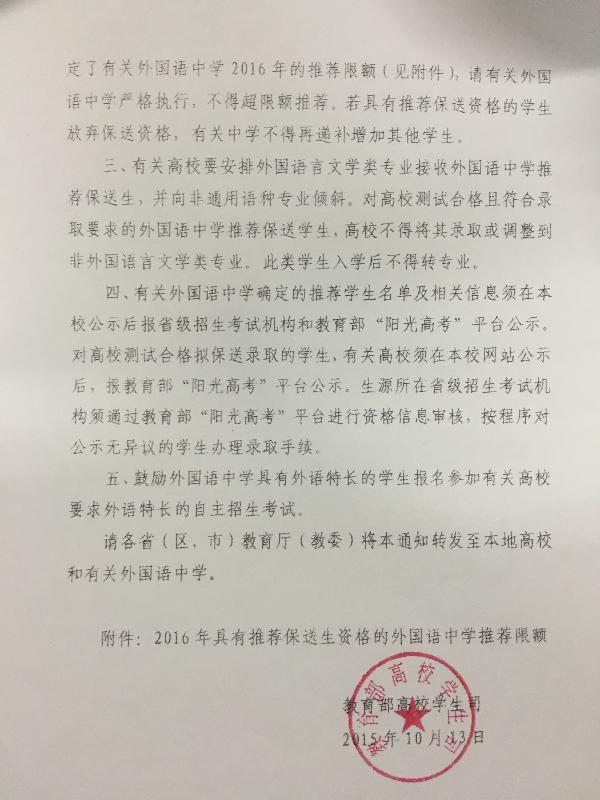 湘教通〔2015〕518号 转发教育部高校学生司关于做好2016年部分外国语中学推荐保送生工作的通知 各普通高等学校: 现将教育部高校学生司《关于做好2016年部分外国语中学推荐保送生工作的通知》(教学司〔2015〕25号)转发给你们,请遵照执行,确保公平公正和科学选才。 湖南省教育厅 2015年11月13日