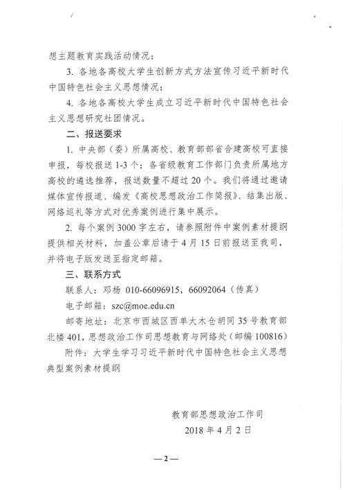 各普通高校: 现将《教育部思想政治工作司关于征集大学生学习习近平新时代中国特色社会主义思想典型案例的通知》(教思政司函〔2018〕8号)转发给你们。请各高校按照通知要求,积极做好推荐工作,每所高校报送不超过2个。省教育厅将集中进行筛选,从高校推荐案例中择优推荐20个报教育部思政司。 请各高校参照教思政司函〔2018〕8号文件附件中案例素材提纲提供相关材料,加盖学校公章后于4月11日下午5:00前报送省教育厅思政处(长沙市东二环二段238号省教育厅902室)。电子版打包发送至邮箱hnjygwxcb@163.com,邮件命名为:典型案例—学校。 联系方式:崔恒源,赵青,谭珊琦,0731-85535605。
