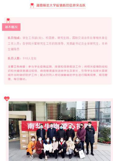 新型冠状病毒感染的肺炎疫情发生以来,湖南师范大学学工战线认真学习党中央、国务院的重要指示批示精神,贯彻执行教育部、省委省政府、省教育厅和省委教育工委的决策部署,在学校党委、行政的坚强领导下,落实学校疫情防控工作领导小组布置的各项工作要求。在防控正处在最吃劲的关键阶段,学工战线把习近平总书记提出的“越是这个时候,越要正确引导”“加强思想政治工作、加强群众心理疏导、加强疫情防控这根弦不能松”等重要指示精神作为决胜指引,始终坚持“四个到底”,切实做好抗疫与暖心并举、防疫与育人相结合,守护高校防控主阵地。