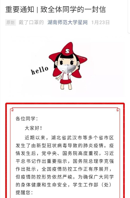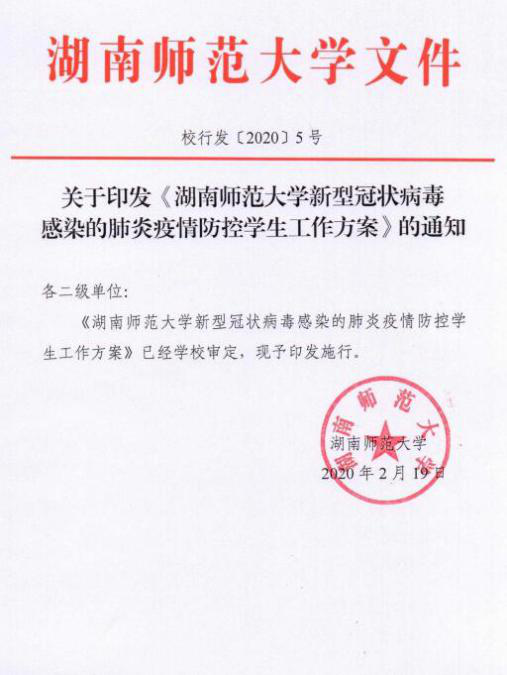 1.成立校院班三级疫情防疫工作小组。学工战线制定发布《湖南师范大学新型冠状病毒感染的肺炎疫情防控学生工作方案》,严格执行教育部“五个一律”相关指示要求,实行“紧盯到人”工作机制,层层压实各单位主体工作责任,组织开展《我是湖师辅导员》网上承诺书活动,全员投入决胜疫情工作。