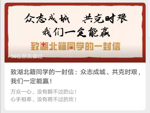 2. 重点关切湖北籍学生实际困难。为鼓舞湖北籍学生坚强抗疫,学工战线撰发了《致湖北籍同学的一封信》,转达了学校党委、行政对学生平安归来的期盼与叮咛。在湖北籍学生和家长遇到困难时,学工系统全员发动、迅速响应,齐心协力帮助学生解决遇到的难题。