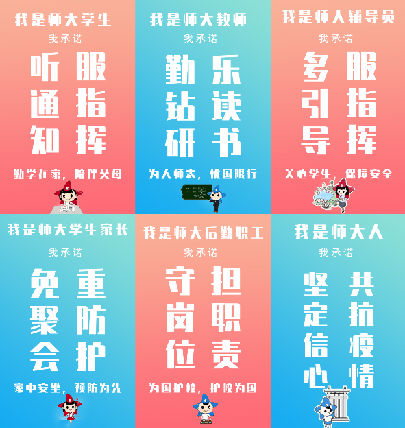 1. 专题教育实践引导学生坚定信心,涵养自我。学工战线坚持“为了一切学生”,发布了《致全体同学的一封信》、《我是师大人,我承诺》,录制了辅导员原创诗朗诵《无畏者必胜》,帮助广大学生客观理性认识疫情,传达关心关爱的同时强化对学生“不提前返校”的宣传教育。根据防控需要,学工战线创新教育活动形式,组织实施“一封家书传真情,一份承诺显担当,一次孝行表感恩,一本好书悦青春,一部影片守初心,一门课程强学习”六个一系列防控疫情专题教育活动,累计收到家书1000余篇,承诺人数达30000余人。