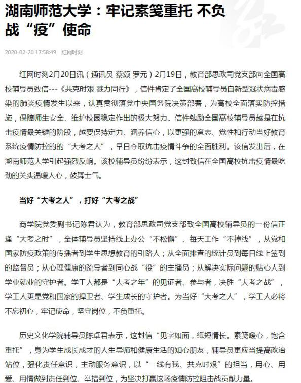在全国疫情防控不能松劲的关键节点,作为高校思想政治教育工作者,湖南师范大学全体辅导员内化“仁爱精勤”的校训精神,用真情传递大爱,用奉献诠释职责,从党和国家防疫政策的传播者到学生思想教育的引路人;从全面排查的统计员到每日线上签到的监督员;从心理健康的疏导者到同心战“疫”的主播员;从解决实际问题的贴心人到学业就业的守护者,自觉作为“大考之时”的参与者、破局者,决胜“大考之战”,毫不松懈、下沉到底把工作做实做深,为早日夺取疫情防控全面胜利贡献力量,不获全胜绝不轻言成功。