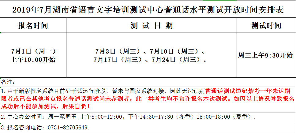 2019年7月湖南省语言文字培训测试中心普通话水平测试开放时间安排表