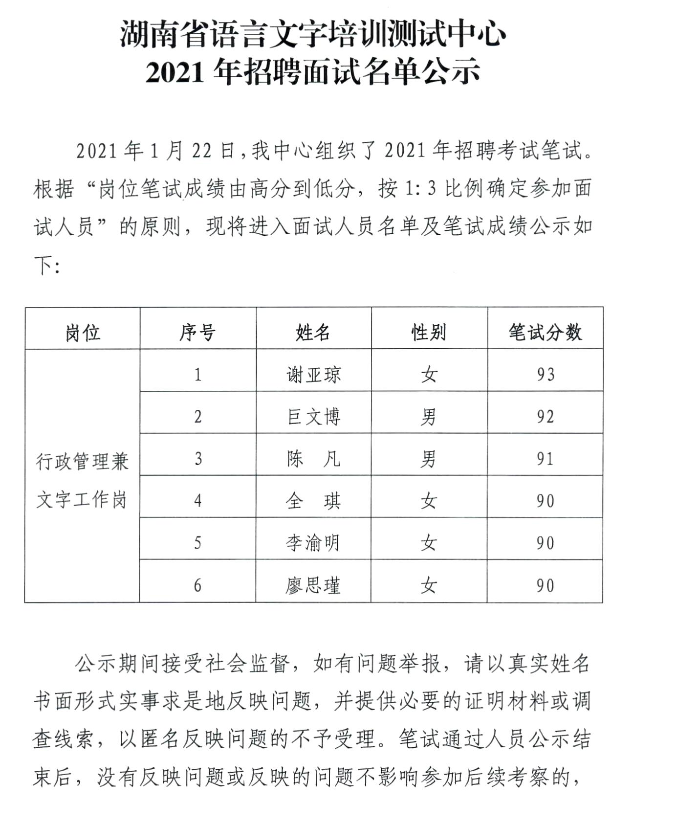 湖南省语言文字培训测试中心2021年招聘面试名单公示