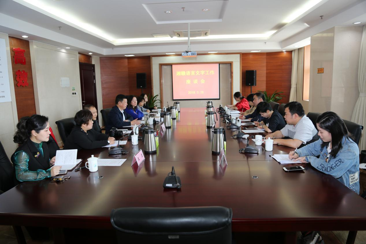 3月28日下午,江西省语委办在江西省教育发展大厦组织召开湘赣语言文字工作座谈会。会上,江西省语委办主任王俊就语言文字工作督导评估、普通话测试站标准化建设、语言文字人才队伍建设和县域普通话普及调查等工作情况做了简要介绍,并向学习考察组展示了江西省普通话测试站标准化建设成果。冯传书主任指出,首届世界语言资源保护大会将于2018年9月落户湖南长沙,这是一个宣传并深入开展语言文字工作的契机。此次赴河北和江西交流学习工作经验,正是为了以更好的面貌迎接这次世界语保大会,也是为了更加科学地推广湖南省的语言文字工作,力求在突出湖南语言文字魅力的同时达到国家规范标准,让湖南省的语言文字工作跻身全国前列,更加努力做好中国语言资源的名片。座谈会上,大家畅所欲言,学习考察组也就实际工作中遇到的问题在会上进行了交流。