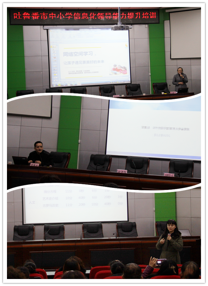 长沙市雨花区长塘里小学校长谢秀云、湖南省电化教育馆副科长赵建军、副科长陈莎为吐鲁番中小学教师信息化培训班授课