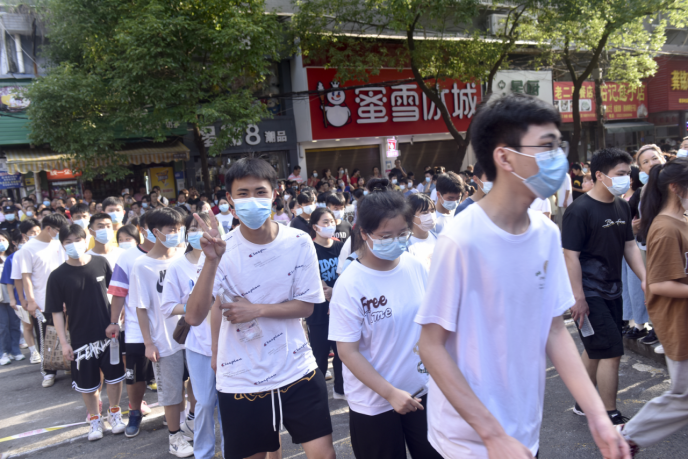 7点55分,考生在工作人员的引导和指挥下,戴着口罩,排成两队有序通过学校门口的热成像测温通道进入考场,他们步履轻松,淡定自若。