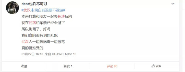 其实,不少本打算外出的武汉游客也纷纷退票退酒店,说:不给大家添堵。
