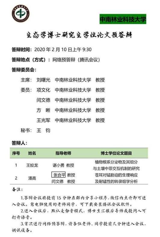 早在2月10日,中南林业科技大学就组织了2020年上半年第一场博士研究生学位论文预答辩,90余人在线参与。这是该校首次采用网络视频远程会议方式组织的学位论文预答辩。预答辩严格按照博士毕业论文正式答辩标准,利用腾讯会议远程视频技术平台进行。为确保研究生毕业论文质量,中南林业科技大学要求所有研究生学位论文必须进行预答辩,未通过者不得送审。针对突如其来的疫情,该校研究生院及时调整安排,将开学前应进行的预答辩和学位申请有关事宜全部改用网络形式实施,确保研究生能按时参加答辩并如期毕业。(田炆佳编辑)