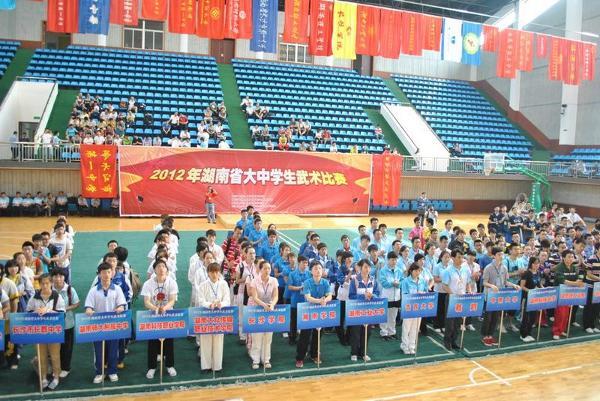 5月17日上午,2012年湖南省大中学生武术比赛在湖南师范大学体育学院体育馆开幕。本次武术比赛由湖南省教育厅主办、湖南师范大学承办,赛程为期3天。比赛设立了拳术类、短器械、长器械、传统类、对练、集体项目等类,将共产生的94枚金牌,94枚银牌,94枚铜牌。来自40所大中学校的近400名武术精英参赛。省教育厅体卫艺处和湖南师范大学体育学院有关负责人出席开幕式并讲话。