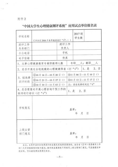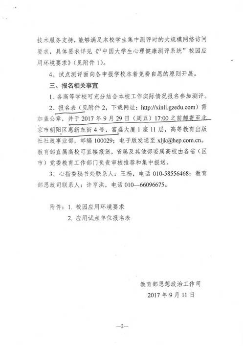 | 各普通高校: 现将《教育部思想政治工作司关于开展“中国大学生心理健康测试系统”试点测评的通知》转发给你们。请你们结合本校实际情况,根据通知规定的心理测试时间、对象以及试点测评的相关要求,自愿申报参加试点测评。凡有意申报试点测评的高校认真填写报名表,加盖公章后于2017年9月26日前邮寄或送达我厅思政处,我厅将对申报情况进行审核并集中推荐报送。 联系人:崔恒源、赵青、谭珊琦,联系电话:0731-85535605、85715329,联系地址:长沙市芙蓉区东二环二段238号湖南省教育厅办公楼1012室。