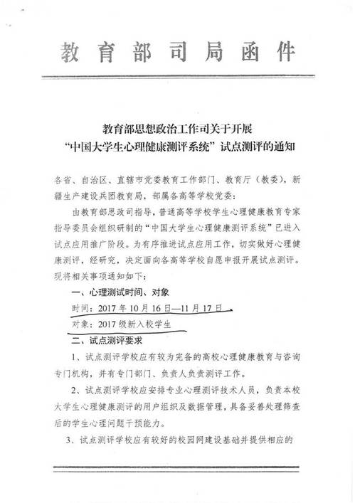 转发教育部思想政治工作司关于开展 “中国大学生心理健康测评系统” 试点测评的通知 |