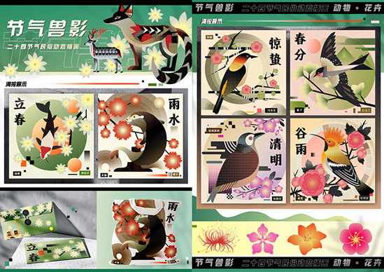 湖南工艺美术职业学院此次入选的作品《节气兽影——二十四节气民俗动态插画》,以中国传统二十四节气为核心主题,巧妙地将每个节气所对应的典型花卉与独特动物元素相融合,运用插画艺术形式进行创意呈现。作品创新融合插画艺术与现代数字动画技术,采用噪点表现技法,将二十四节气民俗插画,以更生动、鲜活、立体的方式呈现,实现了传统文化与现代艺术、数字技术的有机结合。
